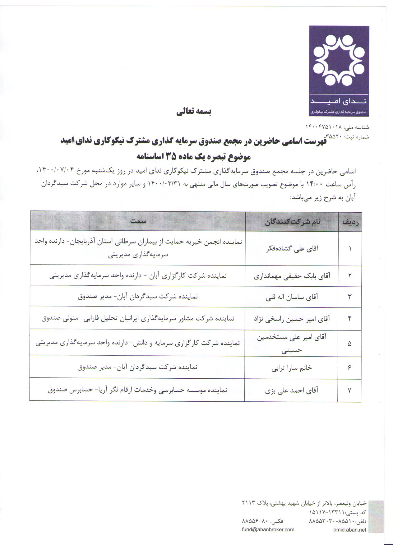 اسامی حاضرین در مجمع صندوق سرمایه گذاری مشترک نیکوکاری ندای امید مورخ 1400/07/04 با موضوع تصویب صورتهای سال مالی منتهی به 1400/03/31 صندوق