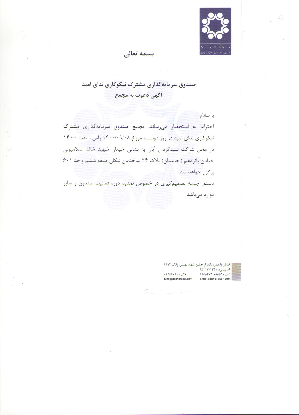 آگهی دعوت به مجمع صندوق سرمایه گذاری مشترک نیکوکاری ندای امید مورخ 1400/09/08 با موضوع تمدید دوره فعالیت صندوق